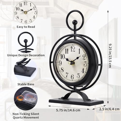 Small Vintage Metal Desk Clock, Decorative Table Clock for Living Room, Silent Mantel Clocks Farmhouse Shelf Decor Battery Operated, 9.5″ Black