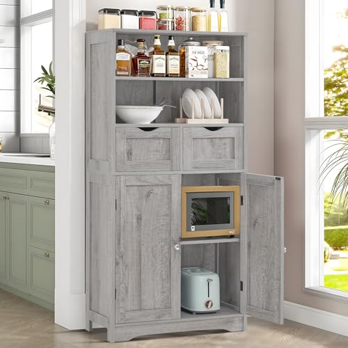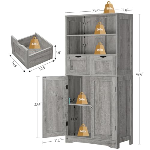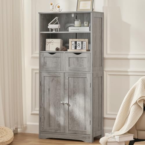 Iwell Tall Storage Cabinet with 2 Drawers & Adjustable Shelves, Bathroom Cabinet with Doors, Cupboard, Floor Cabinet for Living Room, Dining Room, Entryway, Grey