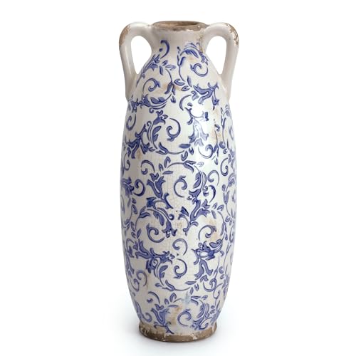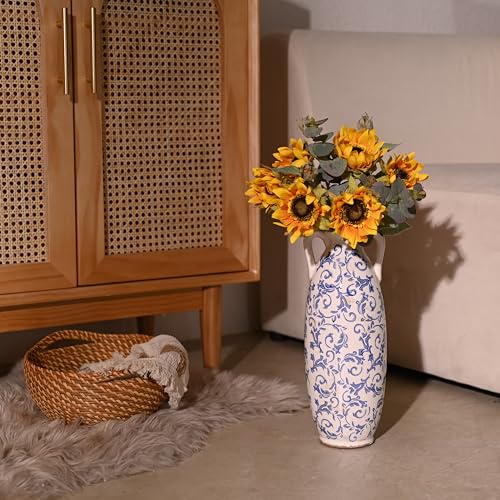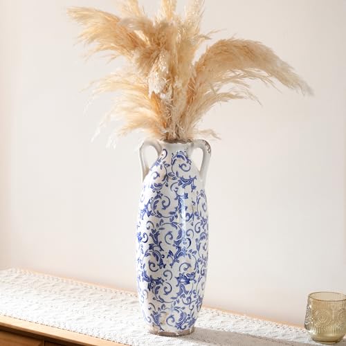 VICTOR & TERESA Blue and White Floor Vase for Pampas Grass, 14” Tall Vase for Home Decor, Ceramic Farmhouse Decorative Large Vases for Flower, Mantel, Living Room, Shelf, Centerpieces, Gift for Her